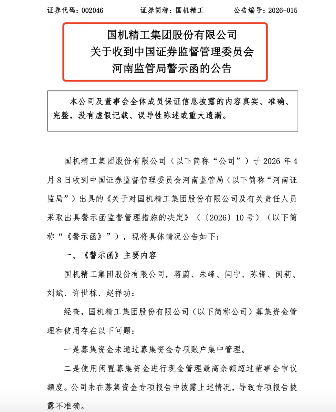 4月8日晚间,国机精工(002046)发布公告称,因在募集资金管理和使用中存在多项违规行为,公司及两任董事长、两任总经理、三任财务总监等收到河南证监局出具的警示函,公司涉及8名高管被记入证券期货市场诚信档案。