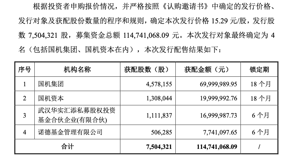 另外两名参与认购的机构投资者为武汉华实汇添私募股权投资基金合伙企业(有限合伙)、诺德基金管理有限公司,分别认购1700万元、774万元的股份。