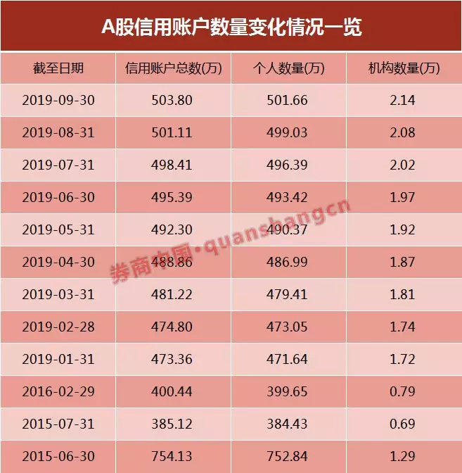 据中登公司数据,至8月末,两市信用账户开户数为501.11万,自2015年7月份以来,首次突破五百万大关。至9月30日,两市信用账户开户数再增至503.8万。
