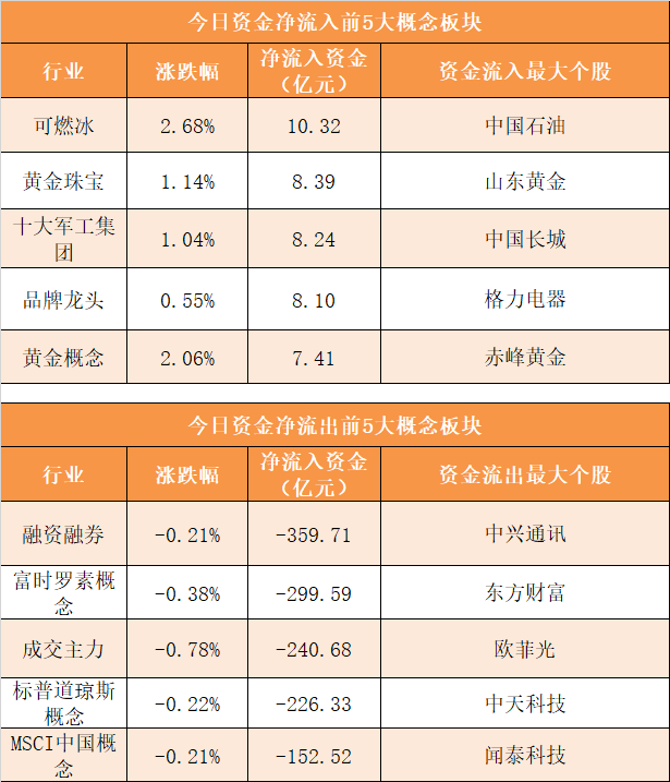 概念板块方面,今日可燃冰、黄金珠宝、十大军工集团、品牌龙头等概念板块资金呈现净流入,其中可燃冰概念净流入10.32亿元居首。