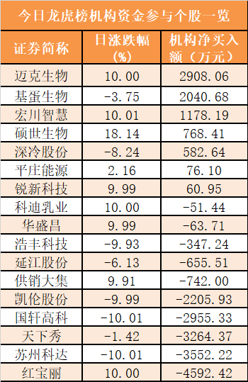 盘后龙虎榜数据显示,机构现身17股,其中迈克生物等7只股票呈现机构资金净买入,红宝丽等10股呈现机构资金净卖出。