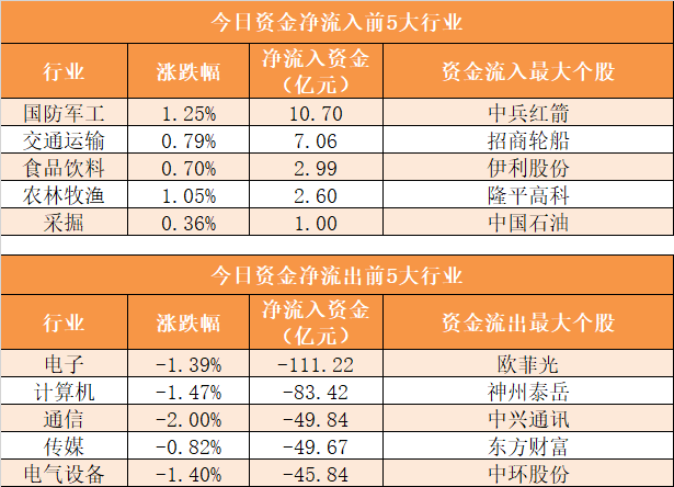 28个申万一级行业中,5个行业实现资金净流入,其中国防军工行业净流入10.7亿元居首。