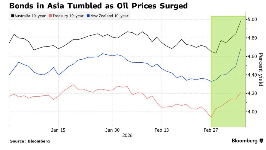 对全球货币政策预期更为敏感的澳大利亚3年期国债收益率一举升至2011年以来最高水平,而德国国债期货价格则跌至接近15年低点;英国、德国和美国的2年期收益率都出现了近年少见的周度大幅上行,这说明市场打的不是“避险买债”,而是“通胀抬头、央行更鹰、前端降息交易重估”的交易。换句话说,地缘政治本身不是决定方向的变量,美以与伊朗之间的冲突对通胀预期和央行反应函数的影响才是。