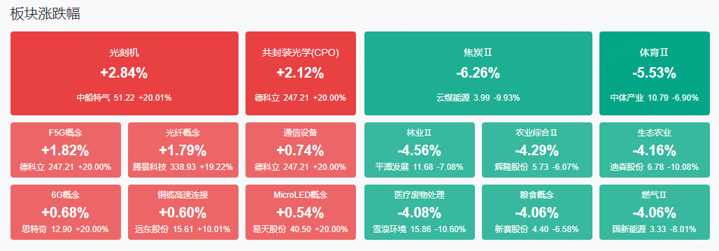 板块方面,激光设备、CPO、光纤等板块表现活跃,煤炭、化工、电力等板块表现落后。截至收盘,沪指跌1%,深成指跌0.99%,创业板指跌0.73%。