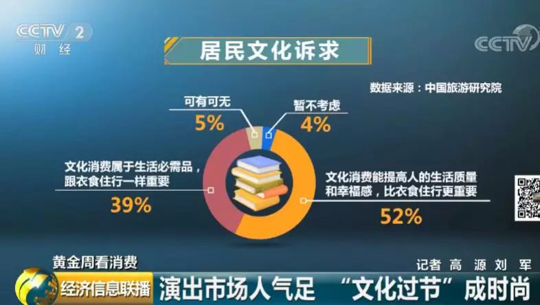 中国旅游研究院发布的文化消费专项调查显示,52%的受访者认为“文化消费能提高人的生活质量和幸福感,比衣食住行更重要”,39%的受访者认为“文化消费属于生活必需品,跟衣食住行一样重要”。