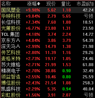 今日柔性屏相关概念股表现活跃,国风塑业、华映科技封板,长信科技大涨超7%,TCL集团、京东方A涨超4%,深天马A涨近3%。消息面上,京东方绵阳6代柔性AMOLED生产线已与8月22日首次向媒体开放,京东方下半年已经出货了涵盖瀑布屏、折叠屏、盲孔屏(屏下摄像头)等柔性AMOLED手机屏。除了京东方,华星光电、深天马、维信诺等中国大陆面板厂也在积极投资建设6代柔性AMOLED生产线,如华星光电6代线今年四季度将投产,深天马刚宣布将在厦门新建一条6代线。