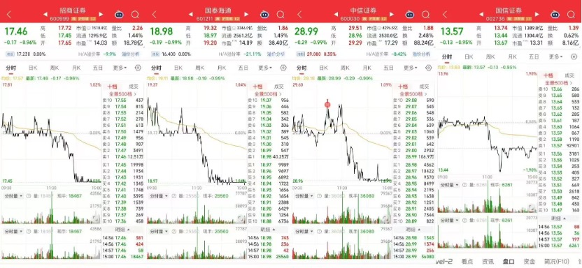 四家头部券商尾盘齐跌1% 卖盘大单压制背后暗藏哪些玄机?