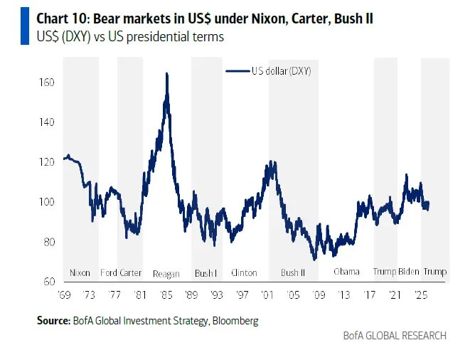 Hartnett对黄金的看法尤为值得关注。他警告称,总统公信力的熊市往往伴随美元熊市——历史上尼克松、卡特、小布什执政期间均出现过类似规律。