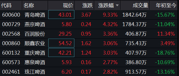 啤酒类个股24日盘中震荡上扬,截至发稿,青岛啤酒涨逾9%,燕京啤酒、重庆啤酒、惠泉啤酒、珠江啤酒等均走强。