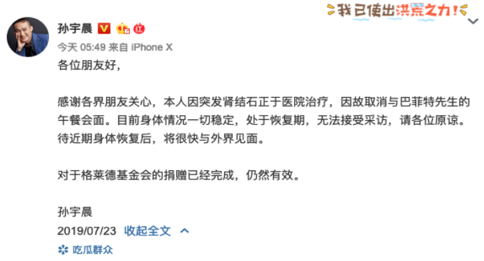 7月23日凌晨,原本即将赴宴巴菲特慈善午宴的孙宇晨在微博发布消息称,“本人因突发肾结石正于医院治疗,因故取消与巴菲特先生的午餐会面。”