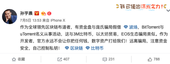 孙宇晨虽然发了条微博辟谣,但是全程并未提及“波场超级社区”的名字,也没有解释 utorrent 和 bitorrent 之间的关系。这条微博引来一众微博网友的吐槽:“早就有人反应,你为什么不说,现在出了事才回答,是不是有纵容犯罪的嫌疑”。