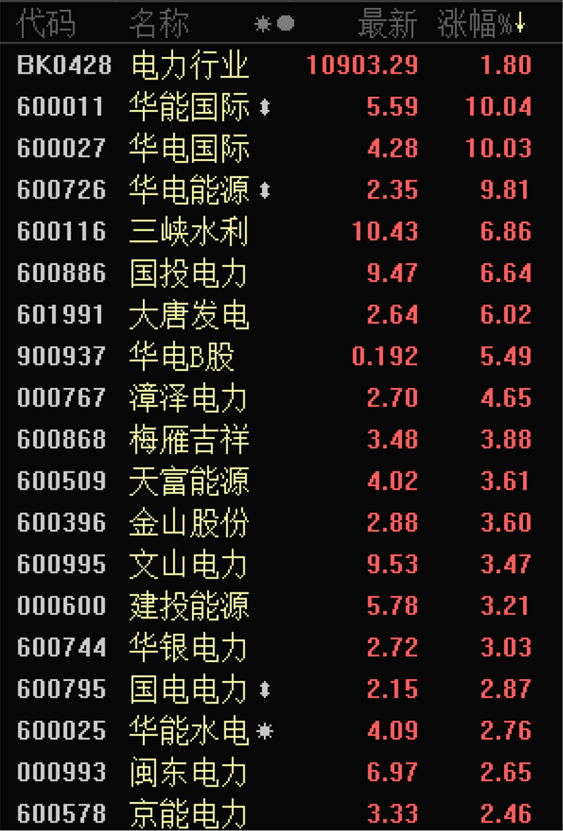 周三,电力板块扛起领涨大旗,火电板块早盘表现较为活跃。在火电板块中,华能国际、华电国际、华电能源等多股涨停。惠天热电、国投电力等涨逾4%。水电板块中,三峡水利涨超7%。