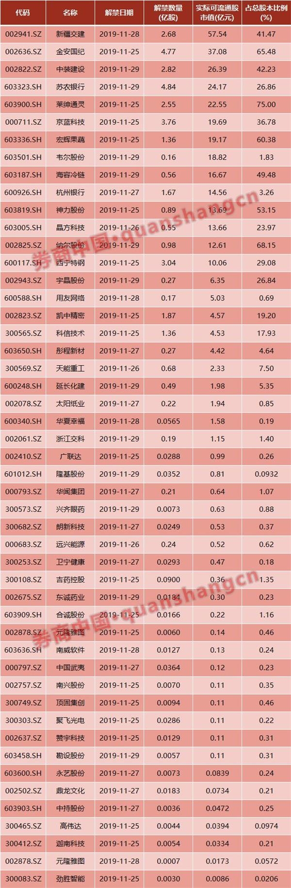 从解禁市值来看,解禁市值居前三位的是:新疆交建(57.54亿元)、金安国纪(37.08亿元)、中装建设(26.39亿元)。