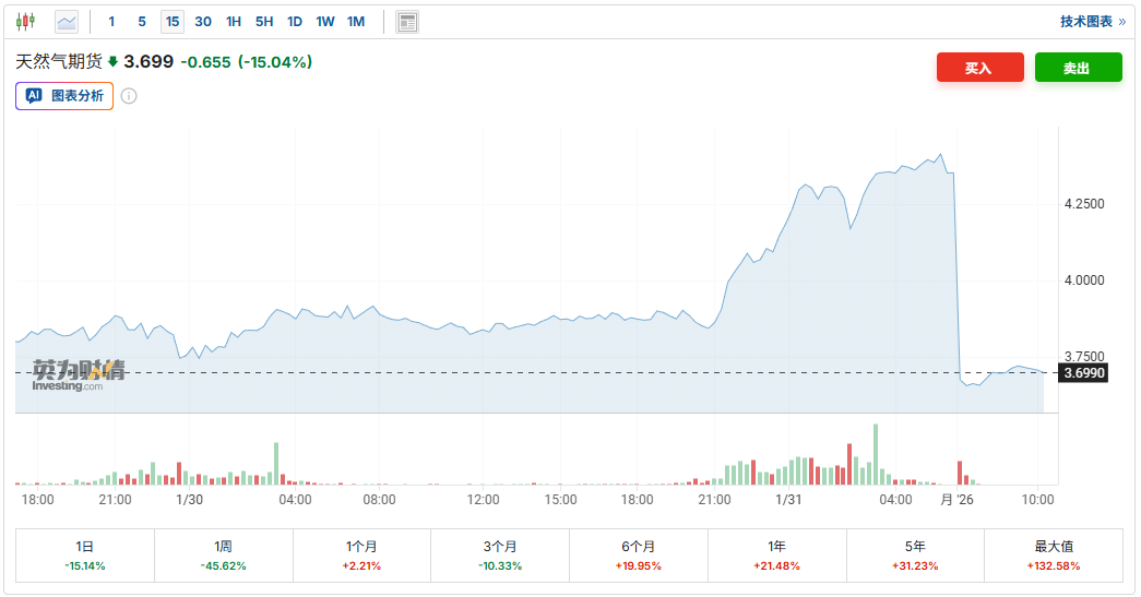 美国天然气期货价格大幅下挫,完全回吐了上周五的涨幅,原因是短期天气预报显示气温将趋于温和。数据显示,截至发稿,美国天然气近月期货跌逾15%,报每百万英热单位3.699美元。此前,在创纪录寒潮来临之前,该期货在上周五曾上涨11%。