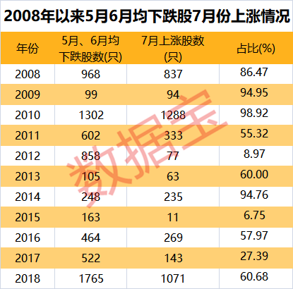 数据宝统计显示,以2008年至2018年数据来看,五月六月下跌股数量达到7096只,其中七月份“翻身”上涨的股票有4421只,占比62.3%。换句话说,历史上“五穷六绝”股七月份上涨概率达到62.3%。