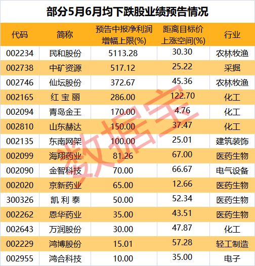 以预告净利润变动上限来看,民和股份今年中报净利润有望增长50倍以上,主要系主营产品商品代鸡苗销售价格较同期有较大幅度上涨,其最新收盘价距离目标价上涨空间超30%;中矿资源预计中报净利润有望增长5倍以上;仙坛股份、红宝丽、青岛金王及山东赫达中报净利润有望增超1.5倍。