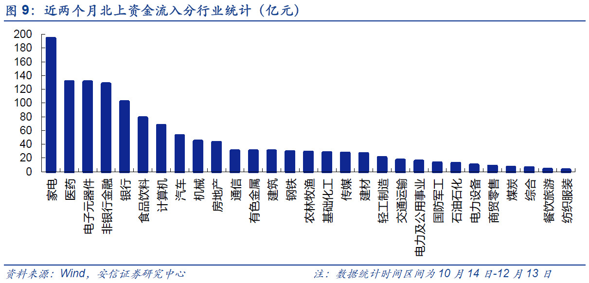 近期外资流入的行业主要是家电、医药、电子、非银等。其中家电、电子、非银近期出现了明显的增配,而医药、银行、房地产的外资流入速度有所放缓。