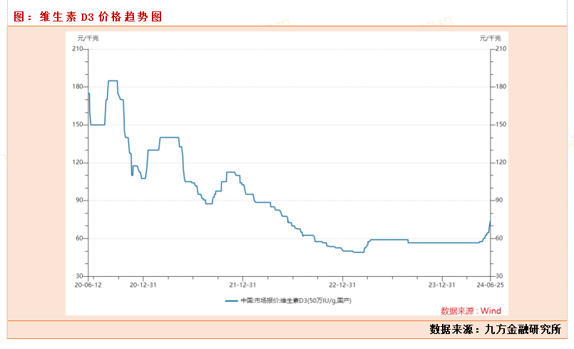 本月以来维生素D3价格一路加速上涨,根据百川盈孚,VD3上周均价65.4元/千克,周环比+3.81%,月环比+10.19%。截止6月24日报价78元/千克,较年初+39.2%,呈现加速上涨态势。VD3从450元/千克(2020年5月)下跌,经过200(2020年9月)-150(2021年3月)-100(2022年3月)三个阶梯后一直没有上涨到100以上,生产企业普遍有压力,下跌主要的因素还是源自于行业花园生物22年的扩产。过去每一轮维生素D3价格大涨,主要是因为供给端因素影响较多。VD3海外厂商主要是帝斯曼等,国内主要有花园生物、金达威、新和成、浙江医药等企业。今年以来维生素D3行业供给端厂家因为长期的价格低迷,开工率不高,海外企业更加是艰难。今年以来,帝斯曼公告称,由于维生素价格长期低迷,动物营养与保健业务面临前所未有压力,公司拟剥离动物营养与保健业务,此前帝斯曼已于23年关闭上海星火VB6工厂、江苏江山VC工厂。同时今年以来维生素D3行业并没有新增产能,叠加海外产能的成本较高,有退出预期。今年以来下游生猪价格持续上涨,也带来需求端的复苏。造成维生素D3价格触底逐步回升,景气度持续好转,我们判断维生素D3价格还会继续新高。当前维生素D3市场惜售情绪浓郁,贸易商价格大涨。目前主流厂家依然处于停签停报状态。经销商市场目前主流接单价上涨至75-80元/公斤左右,且货源难寻。后期厂家报价看涨,经销商市场行情预计随之上行。