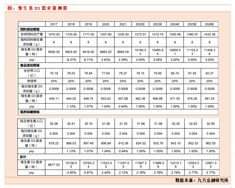 维生素D3需求:维生素D3下游90%用在动物的饲料中,6%用在医药保健领域,用作治疗佝偻病等,还有4%用在食品添加剂。饲料中VD3的添加剂量范围约为650I.U.-30000I.U,即16.25ug-750ug(按50万I.U./g)。我国饲料产量达3亿吨左右,而且每年保持稳定增长。我国是世界上最重要的饲料生产国,占全球饲料产量的比例约为23.75%,全球排名第一。从长期来看,人口扩张将驱动饲料行业持续发展。按照每吨饲料中维生素D3添加量为8g估算,2022年全球饲料级维生素D3的理论需求量约为10180.52吨。整体维生素D3的需求量在1.25万吨左右。