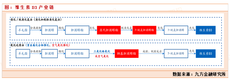 维生素D作为固醇类衍生物是人和动物体内骨骼正常钙化所必需的营养素,具有抗佝偻病作用,其主要成员有维生素D2(麦角钙化醇)和维生素D3(胆钙化醇),其中维生素D3的生物活性明显高于维生素D2,因此在使用上一般都使用维生素D3。与其他的维生素不同,动物体内可自行合成维生素D3,在紫外线(短波高频率的光)的照射下,动物皮下的7-脱氢胆固醇可转化为维生素D3。对于养殖的动物来说,从入栏到出栏它们就长期处于室内,缺乏阳光的照射,就需要从食物中补充维生素D3,所以维生素D3主要下游是用在动物饲料中。