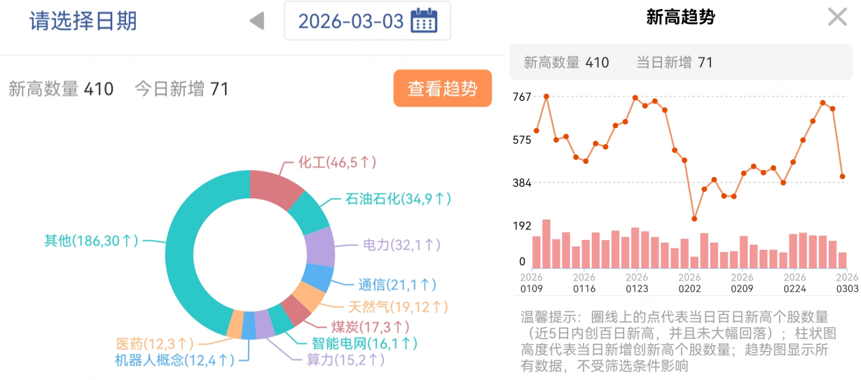 从百日新高去看,板块新高数量前4:化工>石油石化>电力>通信