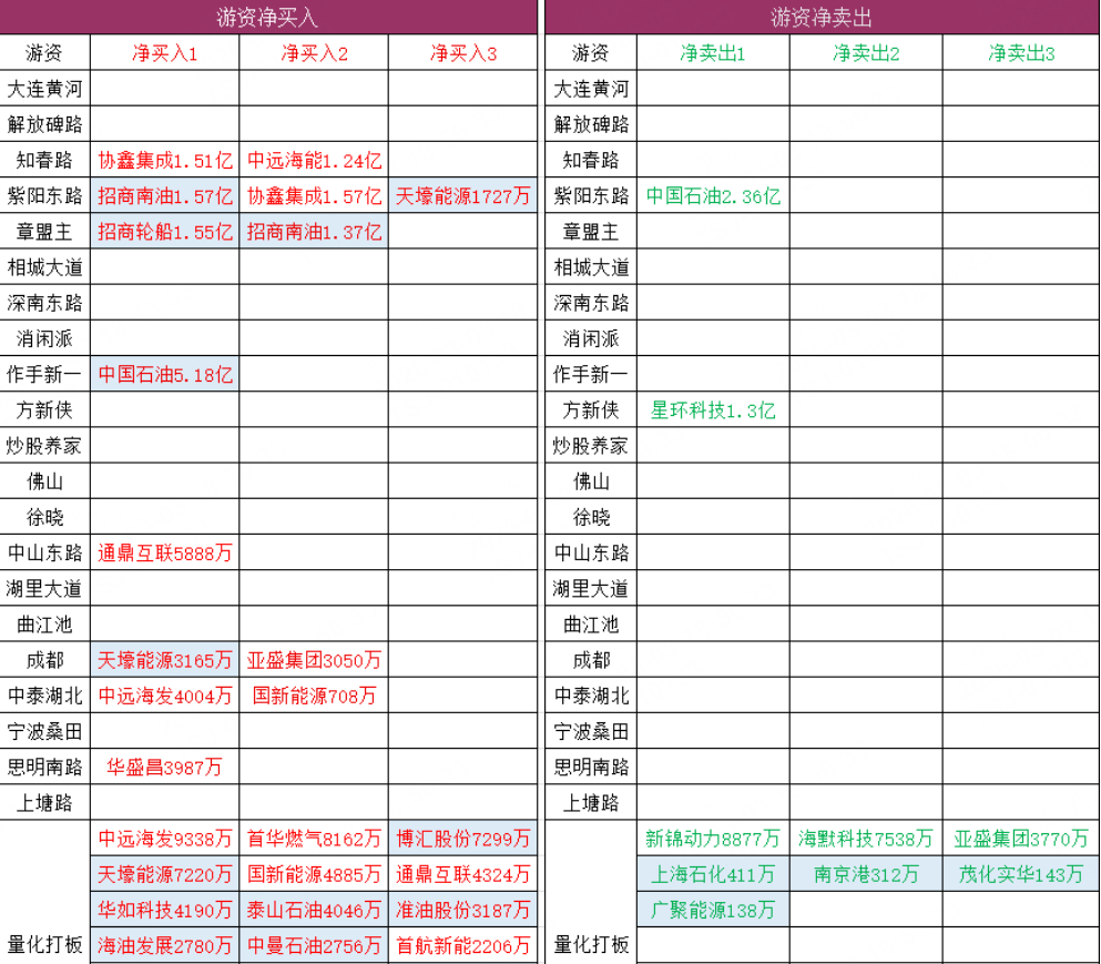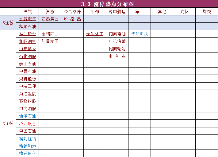 2连板:山东墨龙、准油股份、洲际油气、石化油服、金牛化工、泰山石油、中曼石油、贝肯能源、中油工程、金瑞矿业、招商南油、海油发展、蓝焰控股、华如科技、中海油服、通源石油、中远海能、科力股份、中国石油、潜能恒信、新锦动力、德石股份、惠博普、中国石化、中国海油、上海石化、博迈科、广汇能源、招商轮船、广聚能源、仁智股份、海油工程、南京港、红星发展