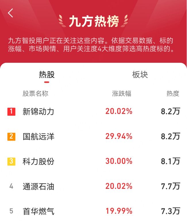 九方热榜:新锦动力,国航远洋,科力股份,通源石油,首华燃气