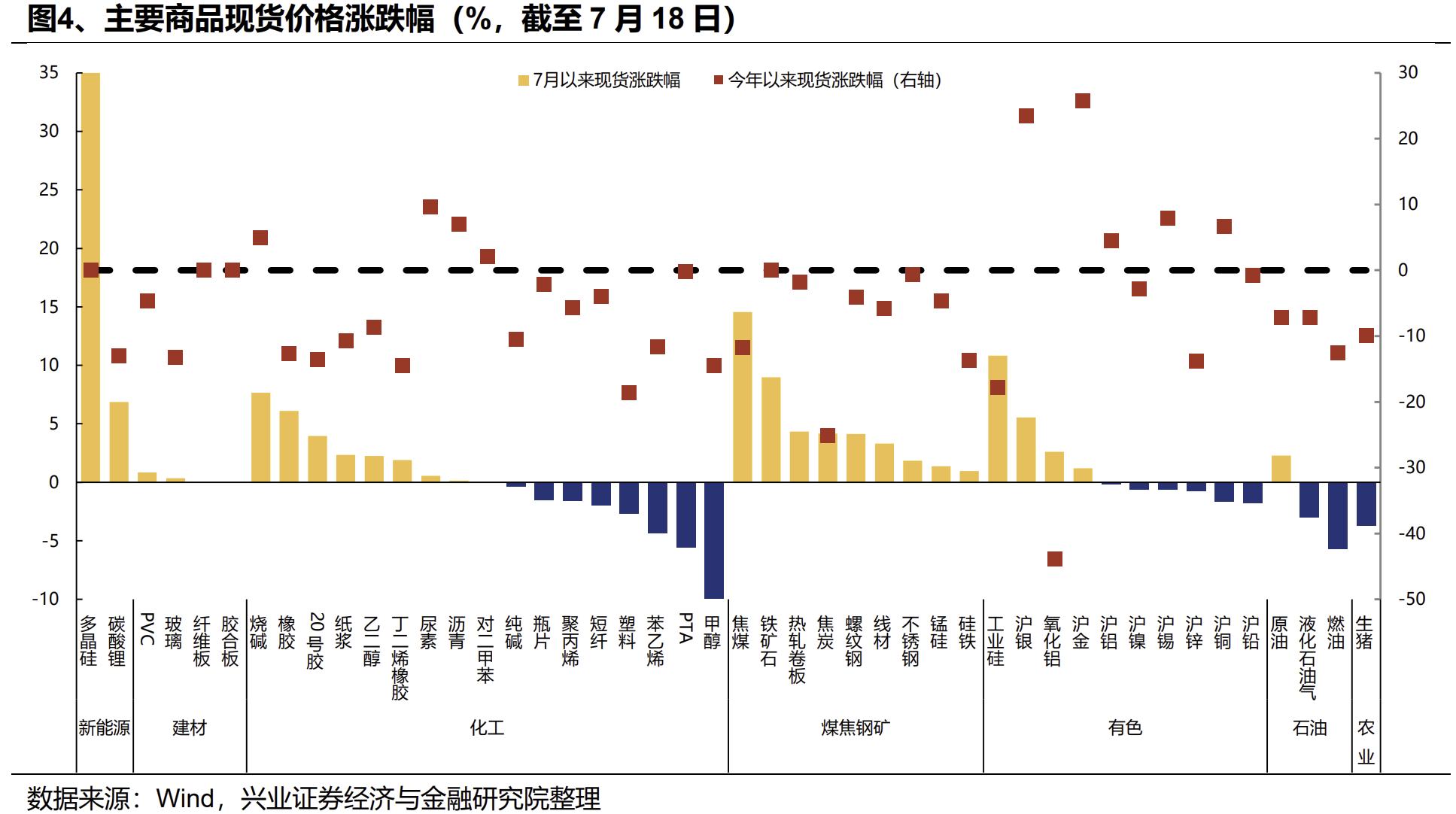 兴业证券发布研报称,随着“反内卷”稳步推进后供给收紧预期升温,叠加高温旺季下需求边际改善,7月以来南华商品指数持续上涨,当前已自5月末的底部涨超7.5%。并且,从季节性来看,随着资源品接连迎来高温用电、“金九银十”、“双十一”、“双十二”等传统需求旺季,下半年是资源品价格上涨的传统窗口。细分品类方面,7月以来期货价格上涨较多的资源品类集中在新能源产业链、黑色系、有色、建材、化工、原油,其中多数品类的现货价格也在实质性涨价,甚至涨幅已超过期货价格。