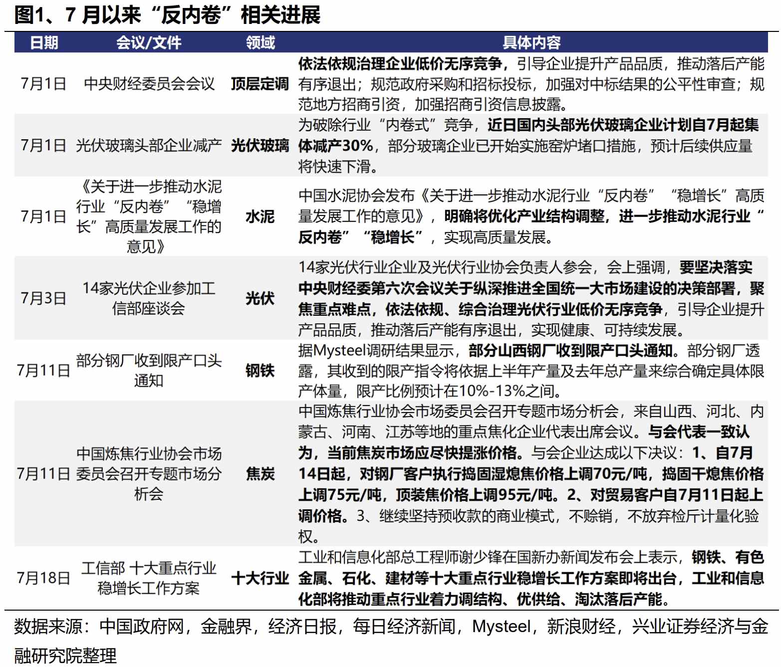 政策对“反内卷”关注度持续提升,各行业整治“内卷式竞争”已有实质性动作。7月初中央财经委员会会议顶层定调“依法依规治理企业低价序竞争”后,各行业部门积极相应,自下而上整治“内卷式竞争”稳步推进,光伏、水泥、钢铁、焦炭等行业已经开始通过减产、提价等实质性动作或发布相应倡议文件,重塑市场秩序、推动行业高质量发展。7月18日工信部表示,“钢铁、有色、石化、建材等十大重点行业稳增长工作方案即将出台,着力调结构、优供给、淘汰落后产能”,政策进一步发力“反内卷”的预期再次升温。