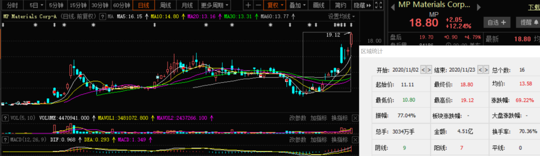 在美股市场,稀土股同样受到资金追捧。由盛和资源参股的全美唯一上市稀土矿商MP Materials昨日大涨12.24%。11月以来,其股价已飙升69%。MP Materials第三季度实现净利润1460万美元,是去年同期的5倍。