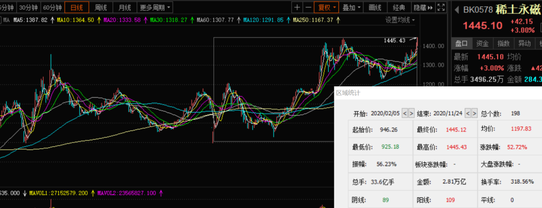 11月以来随着稀土价格持续上涨,个股也强势崛起,稀土板块指数突破5年新高。机构表示,12月出口管制即将生效,稀土价格有望持续走高,未来逆全球化或将持续升温,稀土战略价值有望继续提升。此外,在美股市场,唯一的一只稀土股11月以来也已大涨69%。