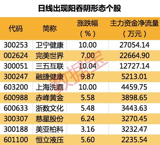 截至2月27日收盘,两市共有25只个股日K线出现阳吞阴形态,当天涨幅最大的是三五互联、卫宁健康、上海洗霸,涨幅分别为10.04%、10%、10%。