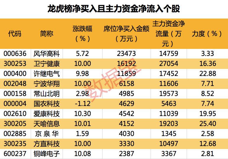 速看!龙虎榜净买入且主力资金净流入个股一览