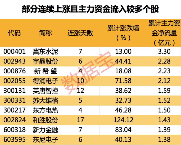 值得注意的是,70只连续上涨个股中,14只个股期间主力资金累计净流入超过亿元。其中,累计资金流入最多的为冀东水泥,主力资金累计流入3.3亿元。