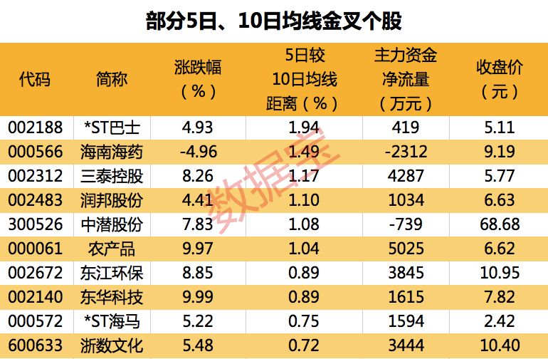 截至最新收盘,有23只A股的5日均线主动上穿10日均线,其中*ST巴士、海南海药、三泰控股等个股的5日均线较10日均线距离最大,分别达1.94%、1.49%、1.17%。