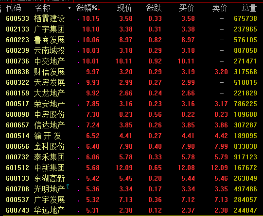 地产板块4日盘中大幅走高,截至发稿,栖霞建设、广宇集团、鲁商发展、云南城投、中交地产、财信发展、天房发展、大龙地产等涨停,荣安地产、中房股份、信达地产涨幅超7%。