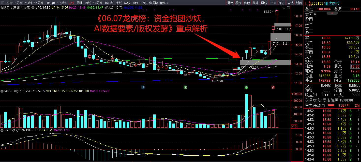 1)润达医疗第二波主升又走出3连板,该股逻辑我们在6月7日文章《06.07龙虎榜:资金抱团炒妖,AI数据要素/版权发酵》重点解析过,这些股从逻辑明确,到震仓清洗浮筹,再到主升浪,基本都给了足够的思考时间。