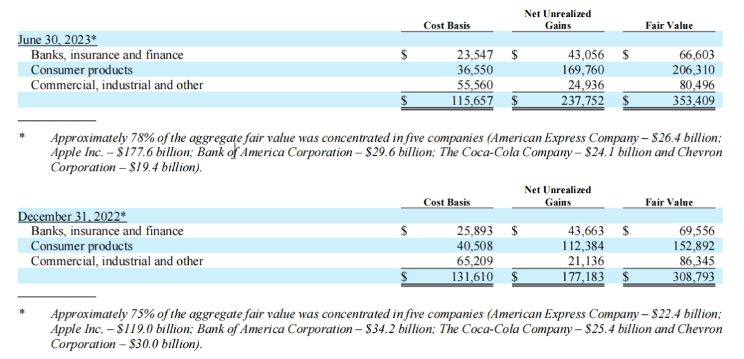 值得注意的是,在2022年末,伯克希尔持有苹果、美国银行、美国运通、可口可乐、雪佛龙的市值分别为1190亿美元、342亿美元、224亿美元、254亿美元、300亿美元。