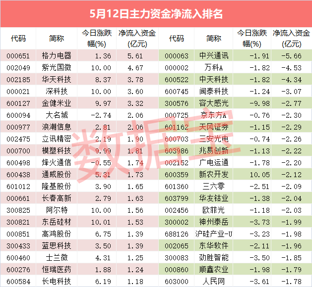 单只股票来看,主力资金净流入超亿元的有18只。家电龙头格力电器净流入规模最高,达到5.61亿元,该股今日上涨1.36%。华天科技、深科技全天净流入资金分别为4.67亿元、3.78亿元,其中深科技涨停,华天科技上涨8.37%。在主力资金净流入额居前的20股中,仅烽火通信、大名城股价飘绿,而东岳硅材、紫光国微、模塑科技、金健米业、深科技等收获涨停板。