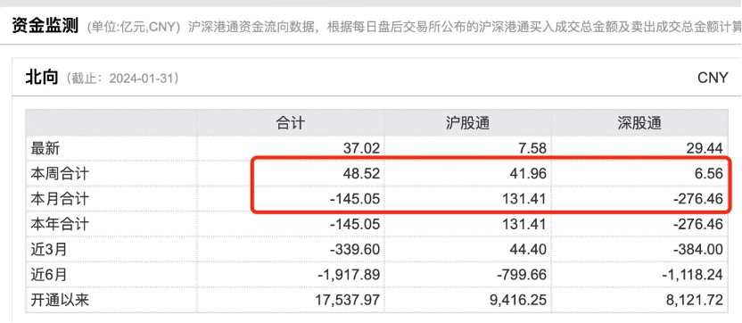 全月来看,北向资金净流出145.05亿元,但是在本月最后一周,资金流向掉头,变成了净流入48.52亿元。