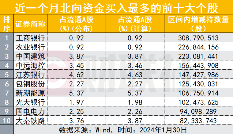 Wind数据显示,今年1月,北向资金买入最多的前十大个股分别是工商银行、农业银行、中国建筑、中远海控、江苏银行、包钢股份、新潮能源、光大银行、国电电力和大秦铁路。其中,银行占据了4个席位,其余分布在交运、电力、能源等领域。