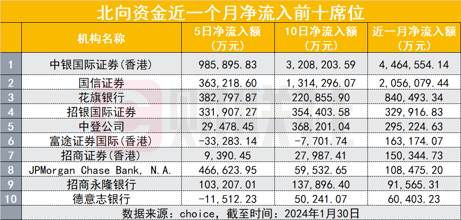 尽管全月是净流出,但是北向抄底频率明显增加。其中,以中银国际香港的席位最为明显,截至1月30日,本月通过该席位买入A股的资金达到446.45亿元,遥遥领先其他席位,其中有320.8亿的资金是近10个交易日流入。此外,不论是近1个月、近10日,还是近5日的资金额来看,中银国际香港稳居第一。