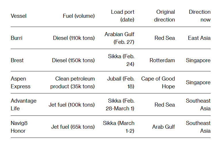 根据机构最新汇编的船舶追踪数据,最近几日有五艘满载柴油、航空类专用燃料等能源货物的大型油轮原本正向西航行,但随后迅速掉头,如今正驶往东亚地区。其中三批货物运输船舶来自印度,另外两批则是在上周霍尔木兹海峡实际上陷入关闭之前驶离波斯湾地区的大型运输船舶。