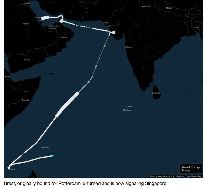 如上图所示的那样,大型Brest号运输船原本驶往鹿特丹,随后掉头,如今的目的地信号显示为新加坡。