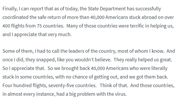 二是在回答要求美国人立即回国的问题时,特朗普表示,截至今天(4月5日),国务院已成功协调了40000多名滞留在国外的美国人的安全回程,他们乘坐75个国家的400多次航班。这些国家中有许多在帮助我们方面都非常了不起,我对此深表感谢。