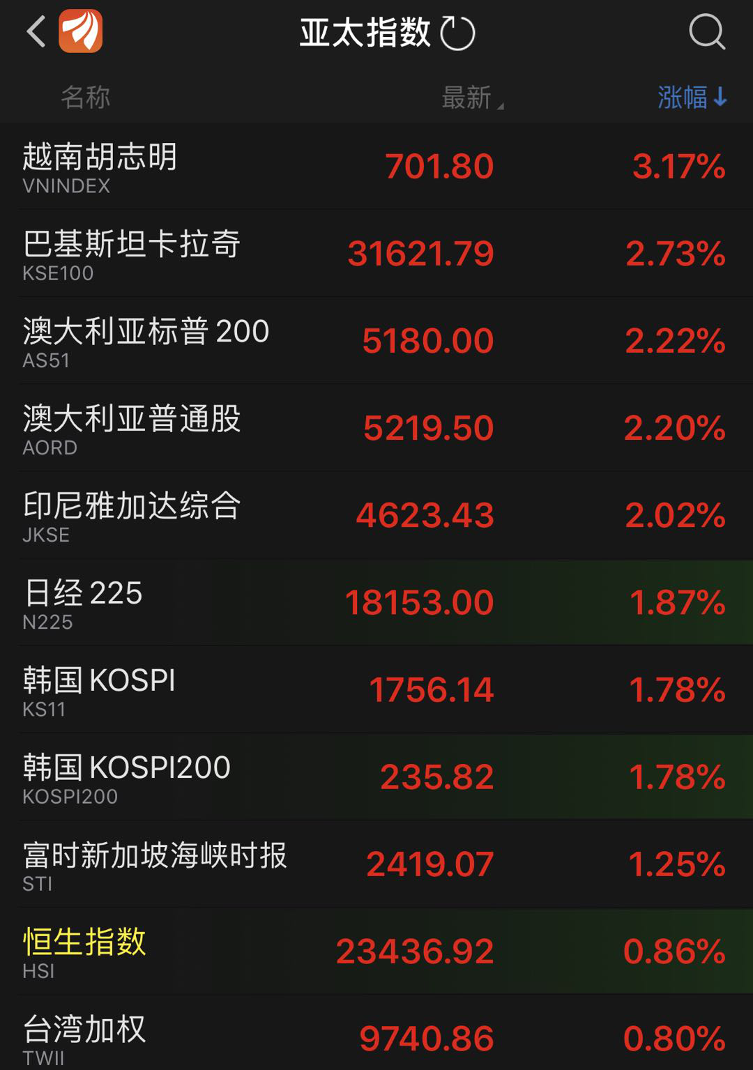 亚太股市场全线飙升,其中日经指数上涨近2%,韩国和澳洲股市亦大幅反弹。
