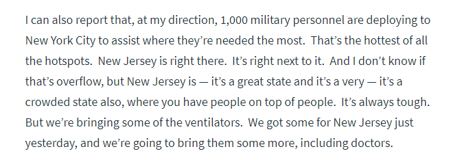 在北京时间昨天的发布会上,特朗普表示,在他指导下,有1000名军事人员正在署到纽约市最需要帮助的地方。