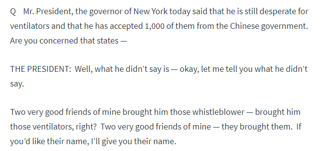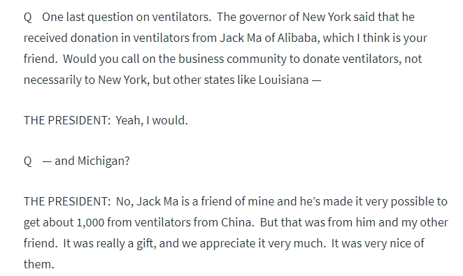 随后,又有记者问:纽约州州长说,他从阿里巴巴的马云那里获得了呼吸机捐赠,我认为这是你的朋友。特朗普回答说,马云是我的一个朋友,他已经使我们从中国获得约1000个呼吸机成为可能。但这是来自他和我的另一个朋友。这确实是一份礼物,我们非常感谢。他们很好。
