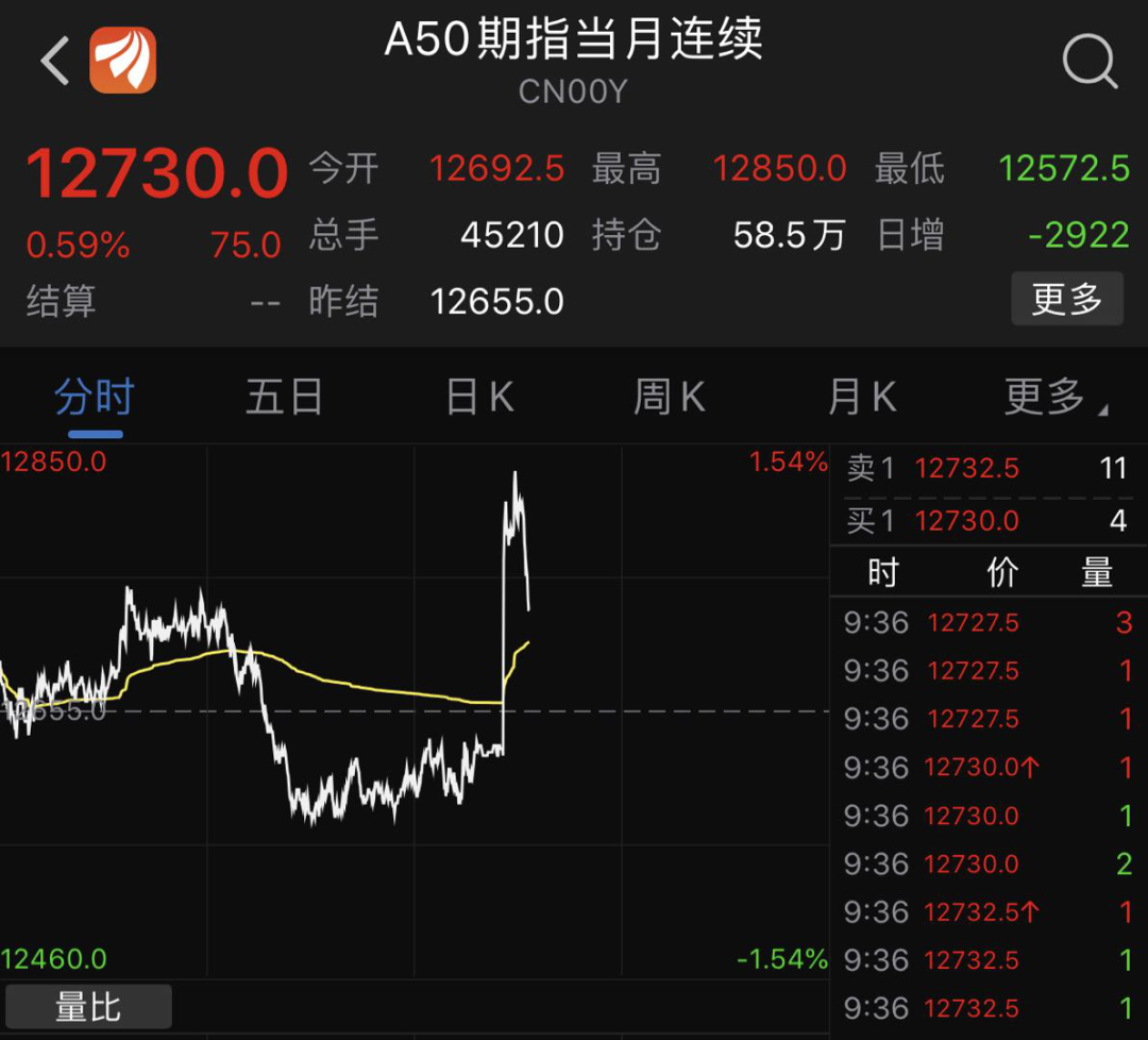 A50亦受外围市场激励,一度直线拉升,现仍小有涨幅。