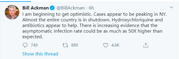 他说:“我开始变得乐观。纽约州的案件似乎达到顶峰。几乎整个国家都处于关闭状态。羟氯喹和抗生素似乎有帮助。越来越多的证据表明,无症状感染率可能比预期高出50倍。像纽约市这里的人,其感染率极高,无症状人群也很多。这对于高密度城市的群体免疫力是一个好兆头。我可能完全错了,但常识告诉我,这值得探讨。广泛的抗体测试将回答这个问题。”